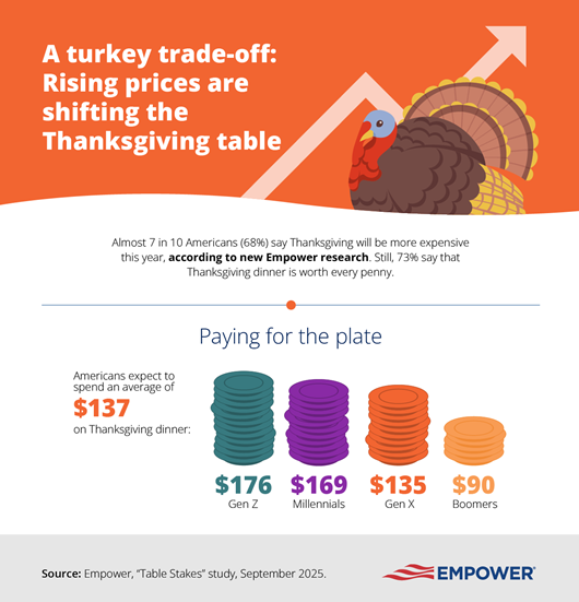 It’s not a cheap spread either. Nearly seven in 10 Americans say Thanksgiving will be more expensive this year due to tariffs and inflation, and the average dinner now runs about $137. Younger generations are getting hit hardest: Gen Z expects to spend $176, Millennials $169, and Boomers $90. Some are scaling back: 42% are planning a smaller holiday to save money, and nearly half say they’re open to swapping turkey for cheaper alternatives like roasted chicken.